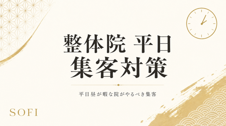 整体院の平日空き枠を埋める7施策(平日昼割・主婦ターゲット・症状LP導線・LINE週次配信ほか)。120院データに基づく構造的原因分析と30日プラン、月売上+30万円改善実例。