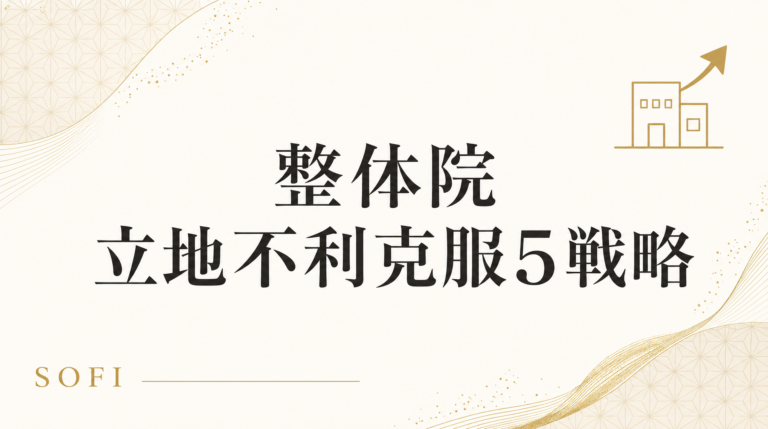 整体院は「目的来店」業態だから立地ハンデを克服可能。SOFI120院データに基づく立地不利克服5戦略(MEO最適化・症状特化・HP訴求・駐車場・LINE&紹介)。月新規6倍化実例。