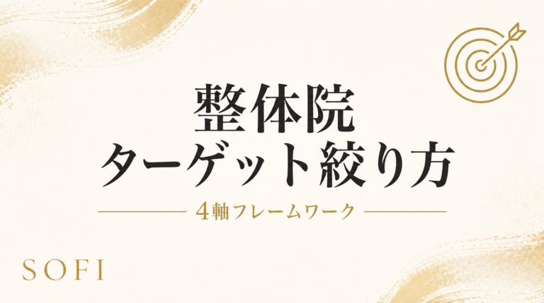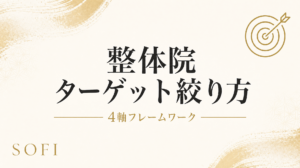 整体院のターゲット絞り込みは新規1.8倍・リピート率15ポイントUP。年齢/職業/症状/動機の4軸フレームワークと、絞っても他患者を断らない運用ルール。30日完成プラン付き。