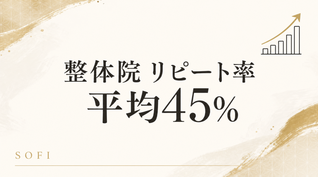 SOFIが大阪を中心に120院の整体院を支援してきた中で算出した「リピート率の業界平均」は約45%でした。これは「初回来店した患者のうち、2回目以降も継続的に来店する割合」を指します。